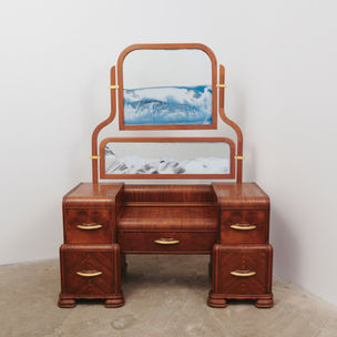 At the heart of the exhibition is The Fountain, sharing its name with DuChamp’s infamous ready-made sculpture, for which Mattis has re-engineered a 1930s waterfall vanity. Replacing the mirror with hand-crafted glass vitrines of rotating sand art, the cross-sections of sand settle into an endless possibility of landscapes meant to generate a soothing visual. In the context of a vanity, however, it recalls the ubiquitous notion of “sand through the hourglass”, highlighting the passage of time alongside the pacifying sensation of meditative calm. The infinite changeover of Mattis’s Fountain also parallels the generative scrolling of social media and the resulting dopamine loop, a constant chasing of the ephemeral.