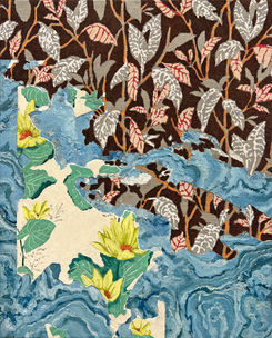 A series of flocked birds patterned on linen are covered with hand-sewn and zippered clear vinyl, as one might cover upholstery. Silk-screened atop the vinyl are different varieties of flowers, providing a visual representation of inter-specific competition— in this case, two patterns of species vying for dominance of the picture plane. The vinyl creates a stark separation, keeping the soft tactility beneath at arms length, both literally and optically, as the flowers dictate the melancholy titles— Sundowner, Forget-Me-Not— evocative of nostalgia, regret, or finitude.