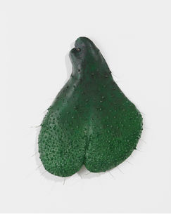In Coat of Arms, 2023, two symmetrical scapular forms resemble a shield or breastplate. They are covered in a monochrome bronze oil powder that becomes a surface somewhere between metal and flesh, with the linen substrate emulating the porousness of skin. The title, borrowing from a medieval system of hereditary iconography, plays on the idea of inheritance as it relates to biology and the ideas and symbols we are taught to ascribe to biological sex. Divine Providence, 2023, is a self-portrait of the artist painted into the tromp l’oeil surface of a citrus fruit so that the markings that delineate the facial features occur as camouflage. In front of the fruit is an invented structure of pearly white twigs and bulbs like a bridal veil, suggesting transformation and protection.